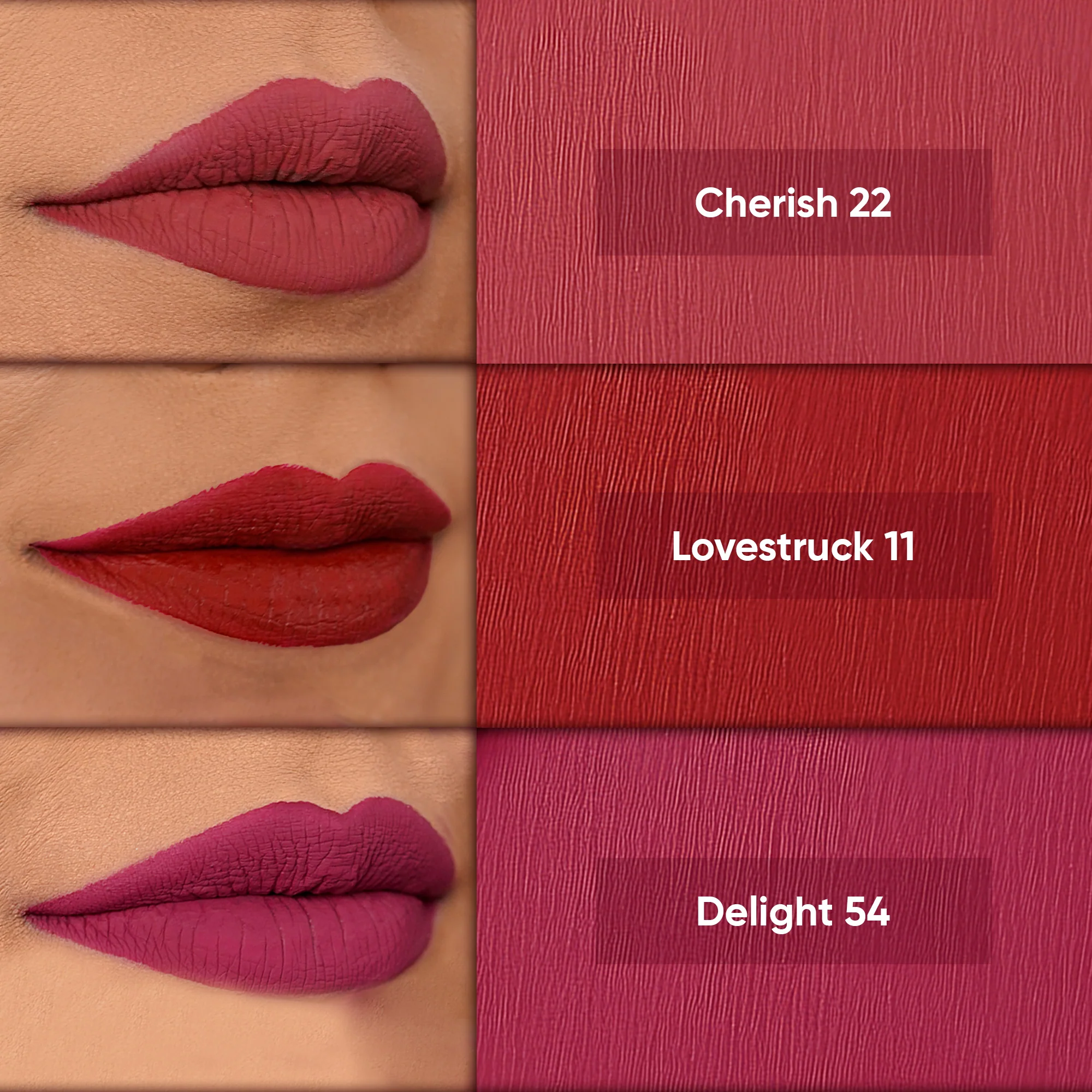 Each shade is meticulously crafted to captivate attention and leave a lasting impression. "Loverstruck 11" brings the timeless elegance of Ruby Red, perfect for those bold moments that demand attention. "Delight 54" offers the richness of Rich-Berry Pink, adding a touch of sophistication to any look. For a deeper, more dramatic appeal, "Cherish 22" delivers the allure of Deep-Rose Pink, evoking romance and passion. Embrace the drama and sophistication of these shades, designed to complement every mood and occasion.